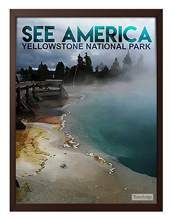 Travelodge - See America Poster - Idaho, Montana, Wyoming "Yellowstone National Park" Charlie Xiao Framed canvas print mounted to a hardboard panel...