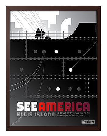 Travelodge - See America Poster - New York "Ellis Island, Part of Statue of Liberty National Monument" Luis Prado Framed canvas print mounted to a ...