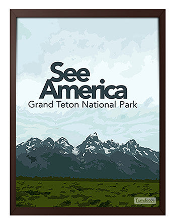 Travelodge - See America Poster - Wyoming "Grand Teton" Sarah McMahon Framed canvas print mounted to a hardboard panel. Available in two sizes and ...