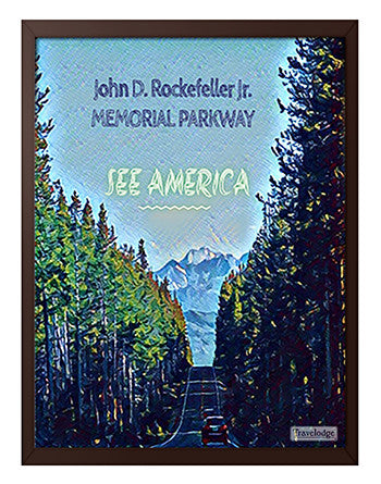 Travelodge - See America Poster - Wyoming "John D. Rockefeller Jr. Memorial Parkway 2" Bryan Bromstrup Framed canvas print mounted to a hardboard p...