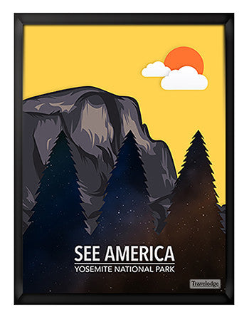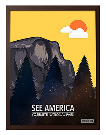 Travelodge - See America Poster - California "Yosemite National Park" Jeff Sun Framed canvas print mounted to a hardboard panel. Available in two s...